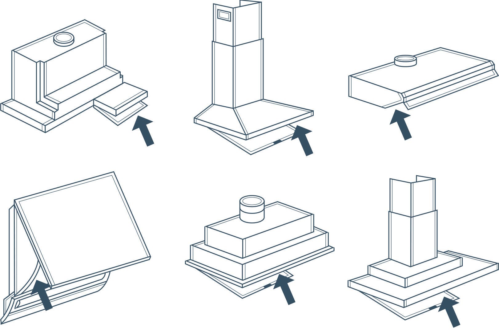 Het type- of modelnummer kun je vaak vinden aan de binnenkant van de afzuigkap. Het kan ook zijn dat deze achter de buitenste filters zit. Op de afbeelding zie je waar je deze in de meeste gevallen te vinden is bij verschillende typen afzuigkappen. Het type- of modelnummer van de afzuigkap bestaat uit een combinatie van letters en cijfers.