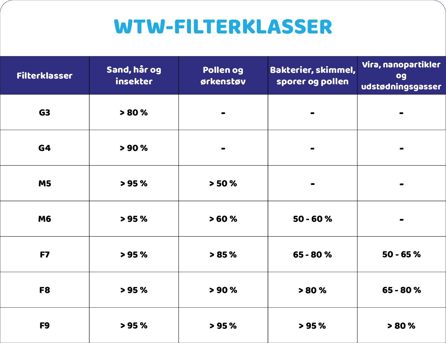 Der findes filtre i klasse G3 og G4 (grov), M5 og M6 (medium) samt F7 (fin).